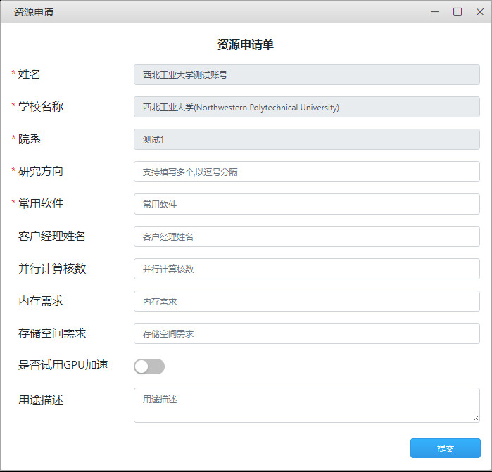 3、第一次登录,会弹出“资源申请”表单,填写相关信息,申请超算资源。学校收到非涉密承诺书并审核通过后,三个工作日内,会开通账号发送至您的邮箱。